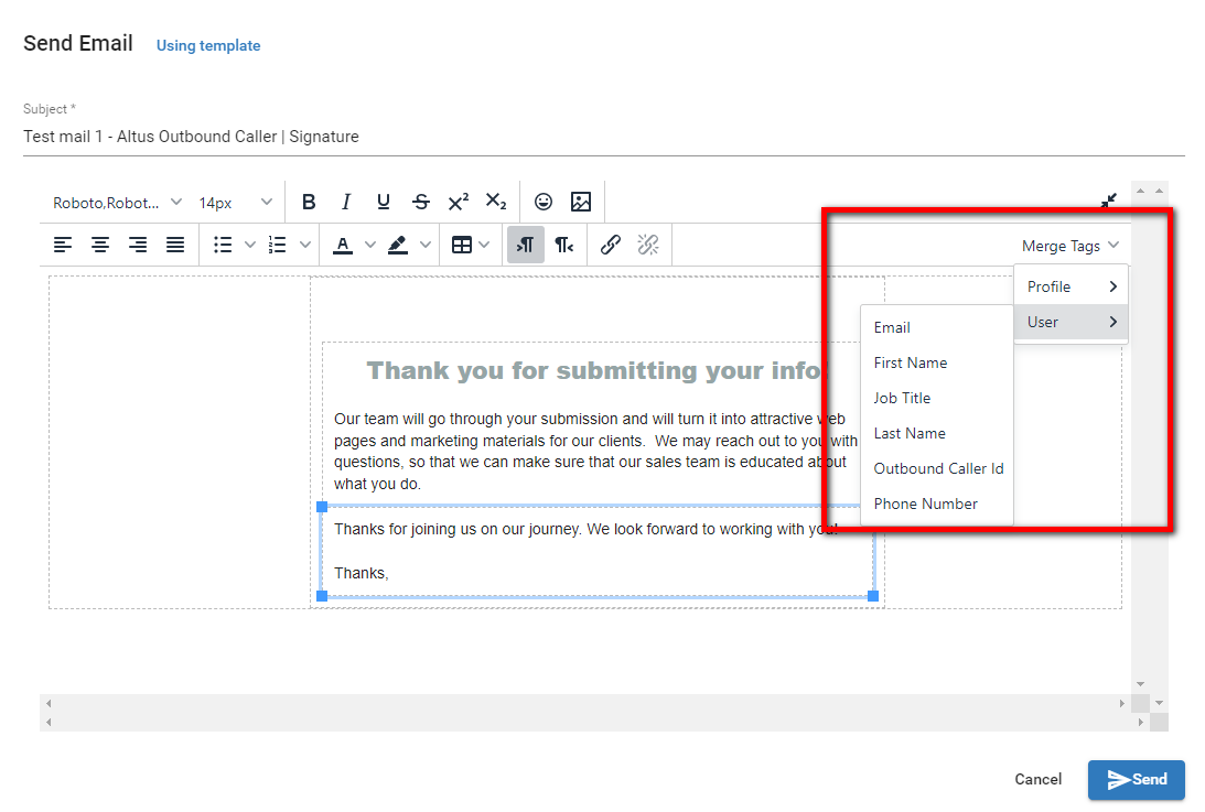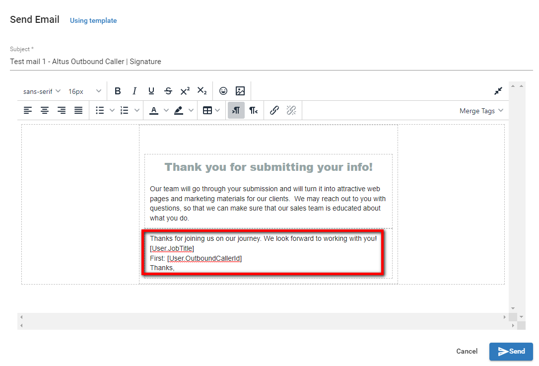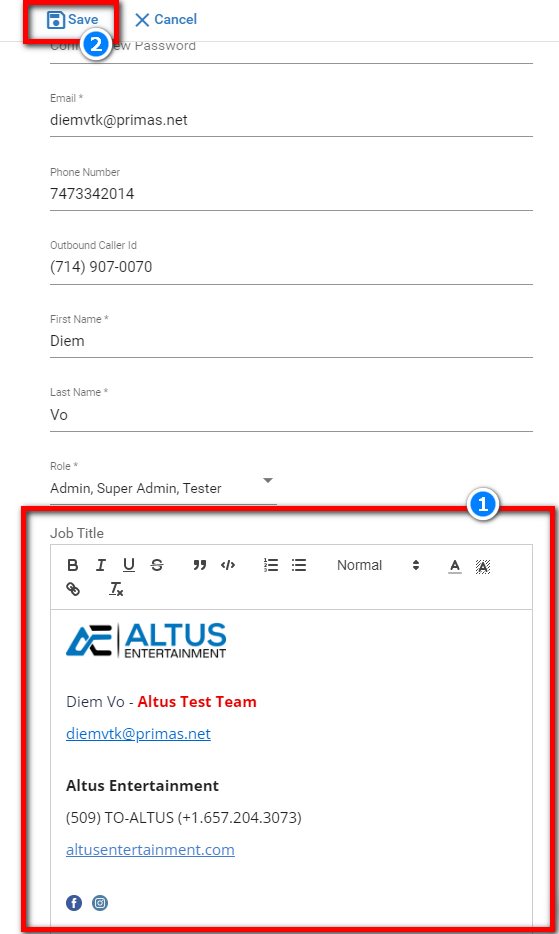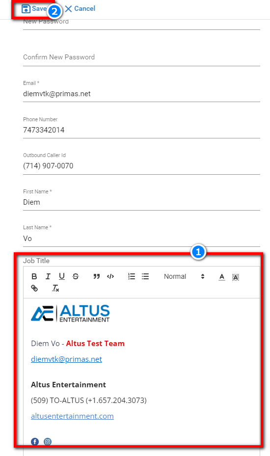 Enter the user job title (individual email signatures) into the job title field (1) and click save (2).